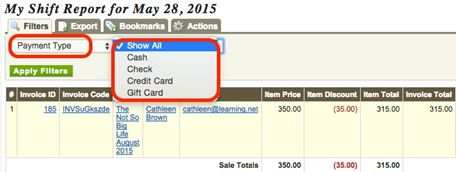 - Payment Type: If you select Payment Type, you can select either Show All, Cash, Credit Card, or Gift Card in the right drop-down menu.