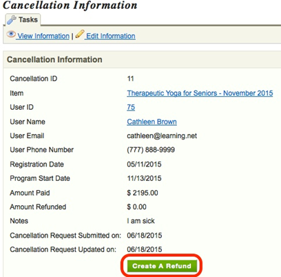 The Cancellation Information screen shows the information that the user submitted on the Cancellation Request Form. From this screen you can select the Create A Refund button to process a refund for this user. This will take you to the Refund screen.